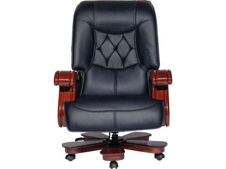Phần đệm tựa bọc da thật tiếp xúc trực tiếp mang lại cảm giác mềm mại, êm ái và sang trọng, trong khi phần còn lại bọc PVC giúp tăng độ bền, dễ vệ sinh và duy trì vẻ ngoài chuyên nghiệp lâu dài. Thiết kế chân tay ghế bằng gỗ sơn vừa chắc chắn vừa tạo điểm nhấn thẩm mỹ hiện đại cho phòng làm việc lãnh đạo.