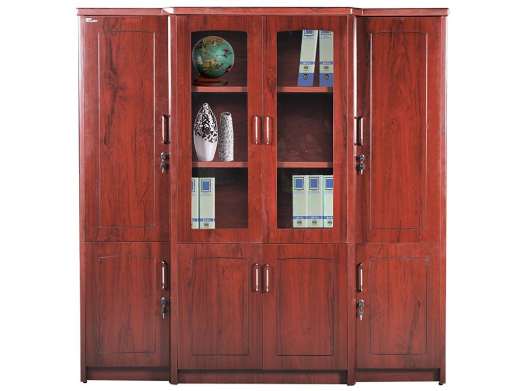 Hai khoang giữa của tủ được chia làm hai phần rõ rệt. Phía trên là khoang cánh khung kính trong suốt – khu vực lý tưởng để trưng bày tài liệu, hồ sơ quan trọng, hoặc các vật phẩm kỷ niệm như bằng khen, cúp lưu niệm. Phần kính dày, trong suốt và khung gỗ chắc chắn giúp không gian lưu trữ trở nên sang trọng hơn. Phía dưới là khoang cánh mở kín, mang lại sự tiện lợi trong việc cất giữ tài liệu, vật dụng không cần trưng bày, đảm bảo tính ngăn nắp và thẩm mỹ cao.
